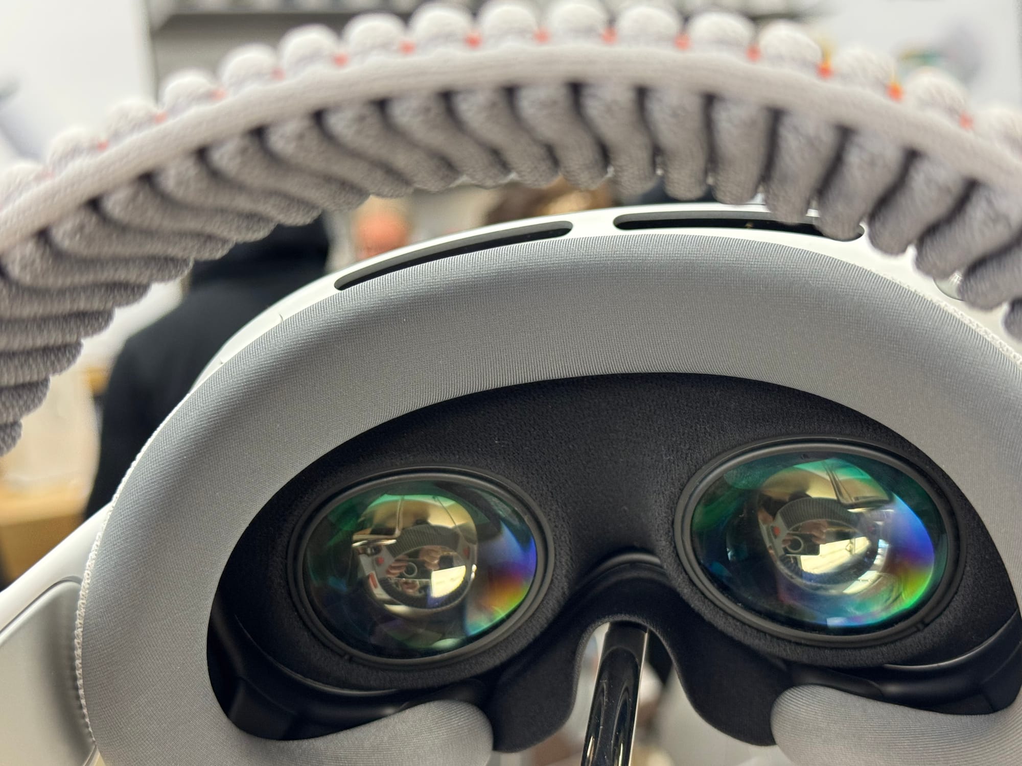 Next up, the first-time placement of the Vision Pro M5 on my head. The new Dual Knit Band is, Clint explained, a big improvement from the original single-band strap. He explained to me how to adjust the top and side bands with a single knob on the right side. Turn it pushed in to adjust one strap, then pull out the knob and turn again to adjust the other. Turn one way to tighten and the other to loosen.